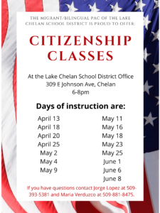 The Lake Chelan School District Migrant/Bilingual PAC is proud to offer free citizenship classes this spring.