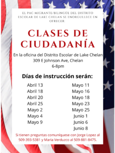 El PAC Migrante/Bilingüe del Distrito Escolar de Lake Chelan se enorgullece en ofrecer clases de ciudadanía gratuitas esta primavera.